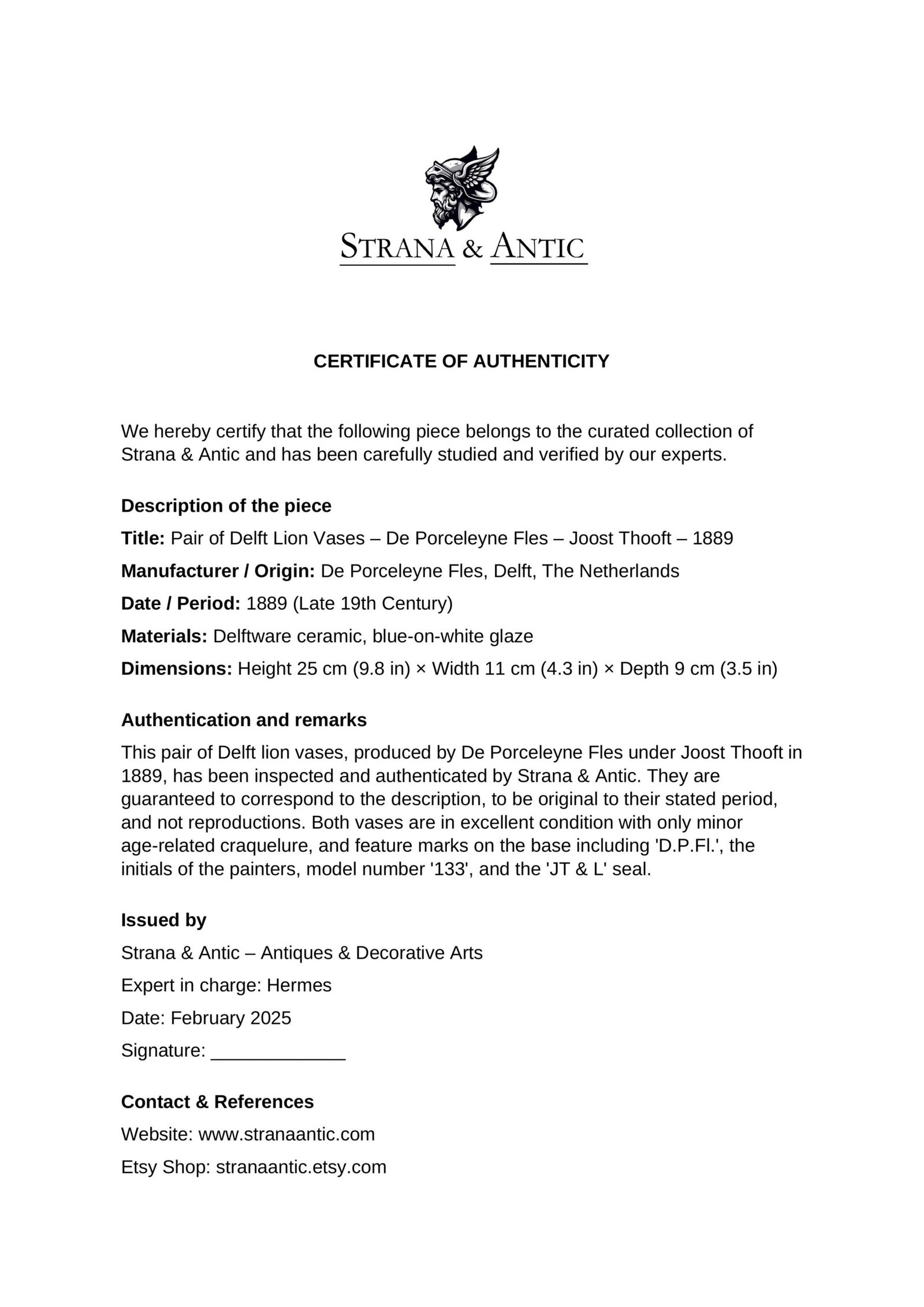 Pair of Vases with Lion – De Porceleyne Fles Delft – Joost Thooft – Year 1889