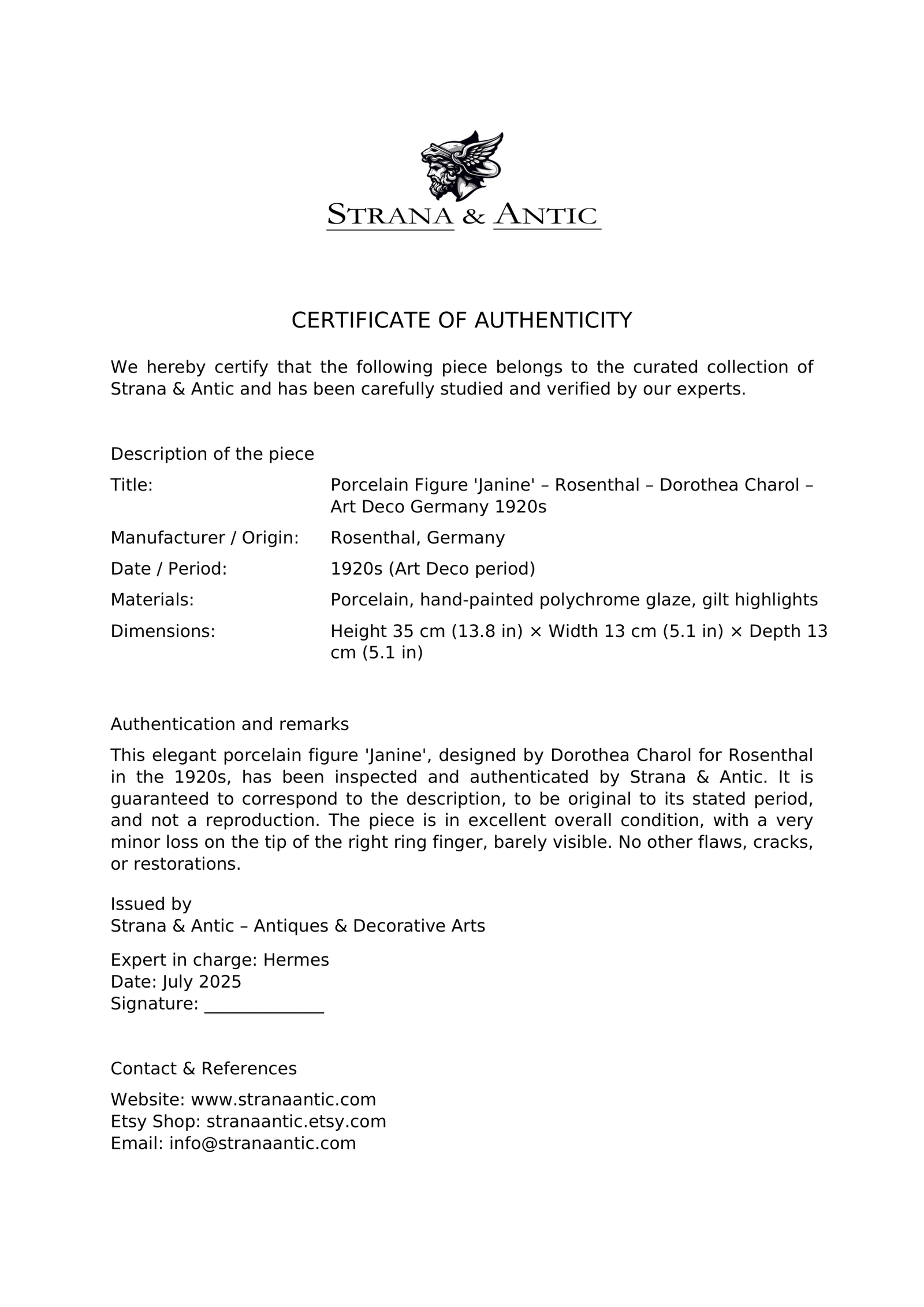Titled “Janine”, the figurine portrays a poised young woman in a moment of rhythmic movement. The modeling is crisp and balanced, and the porcelain surface is hand-painted in soft pastel tones with subtle gilded highlights that accentuate drapery and contours. Signed “D. Charol” on the base and bearing the Rosenthal Bavaria mark of the period, the piece confirms its authentic origin.