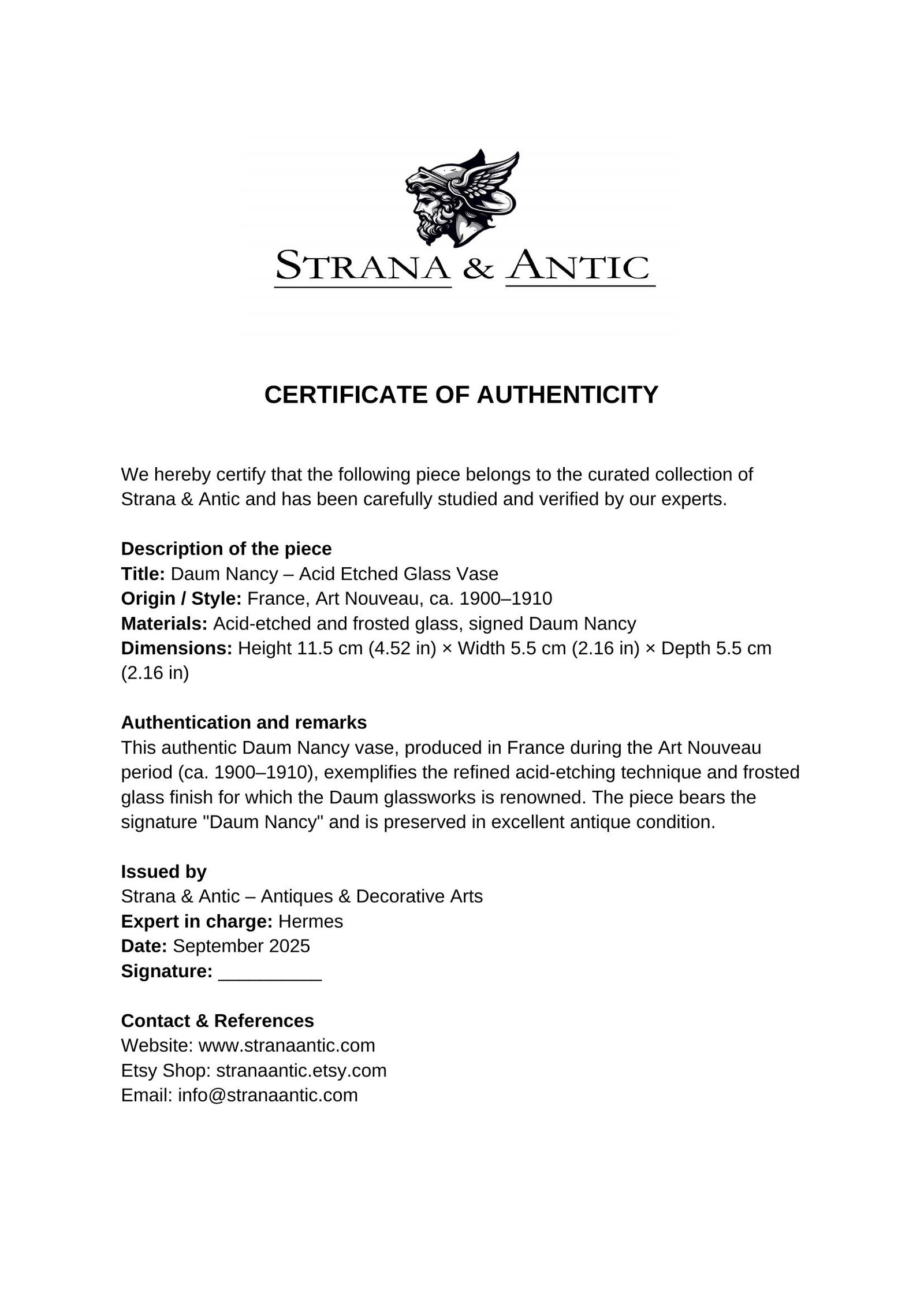 Maker / Attribution: Daum, Nancy — signed in gold with Cross of Lorraine.