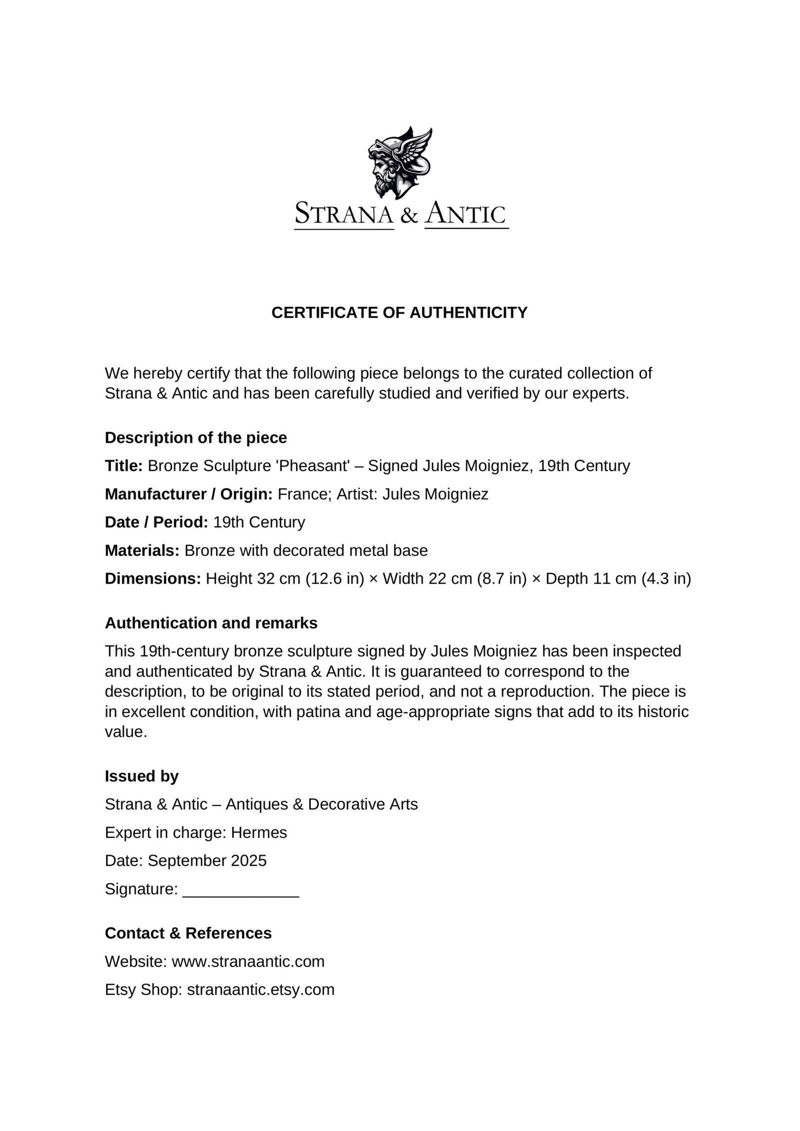 This Jules Moigniez bronze sculpture pheasant shows an excellent patina with only light wear consistent with careful age. A refined statement piece for collectors of 19th-century French bronzes and decorative arts, equally suited for sophisticated interiors or a curated fine-art collection.