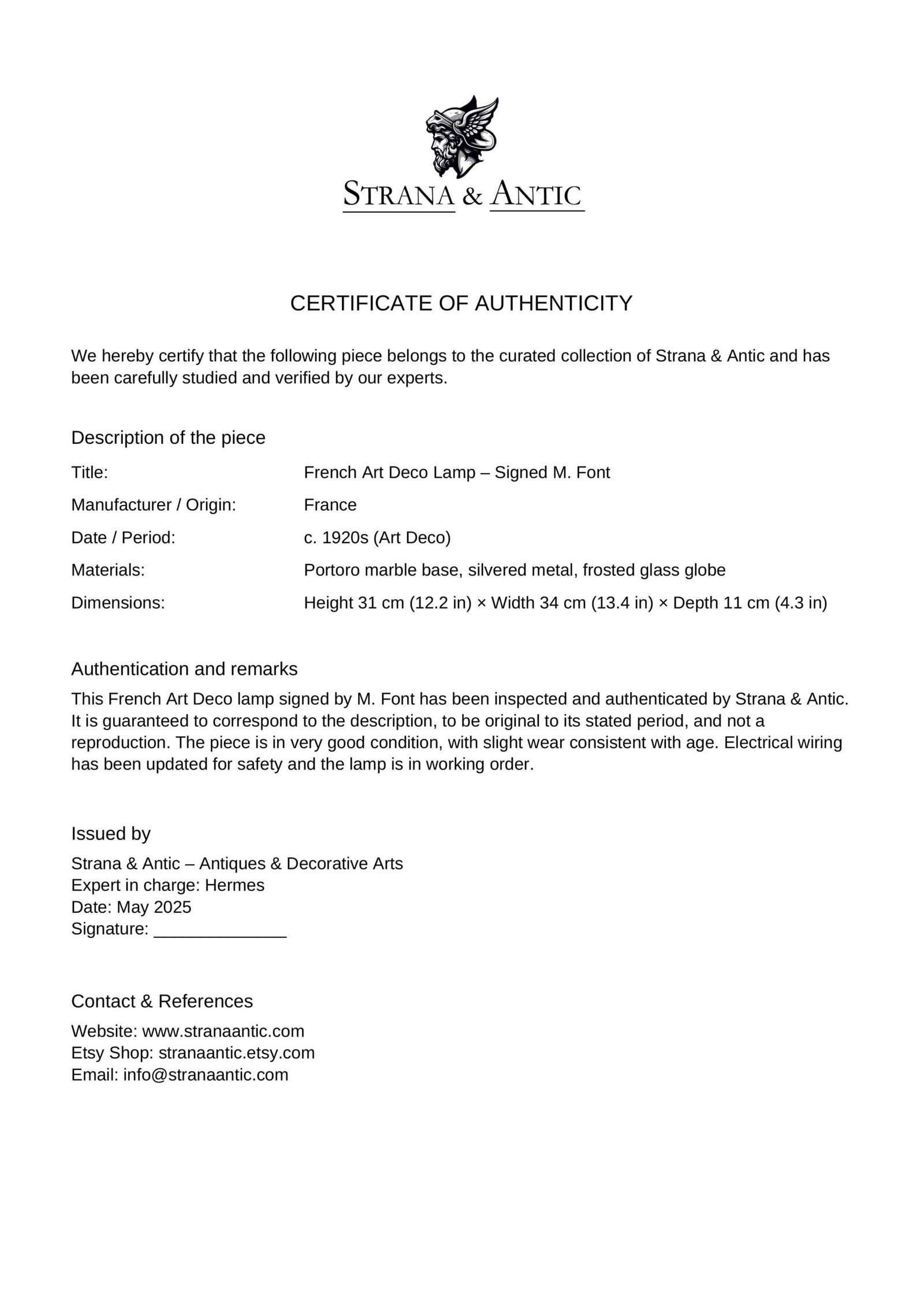 A decorative yet functional statement piece—ideal for refined interiors and for collectors of signed Art Deco lighting. Authentic 1920s–30s production; not a reproduction. This M. Font Art Deco lamp is certified by Strana & Antic.